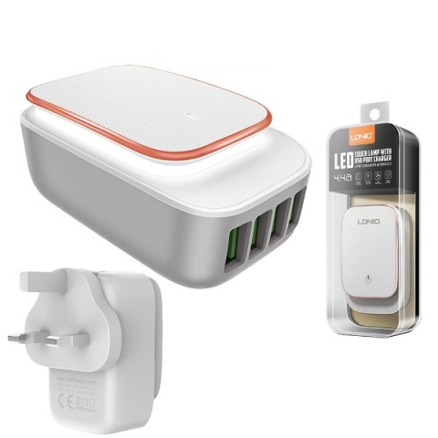Brand Name : LDNIOQuality Certificate of ConformityQuality Certification : RoHSQuality Certification : FCCQuality Certification : Mandatory CertificateQuality Certification : SASOOutput Port : USBOutput Port : LIGHTNINGOutput Port : USB Type-CUSB ports : 4Power Source : AC SourceOutput Port : 5V / 4ASupport fast charge : NoReference : A4405Input Voltage : 100-240V / 0.8AType : Wall chargerColor : White with gold rimOutput power : 22W maxOutput current : 4.4A (Auto max)Type1 : Auto ID USB chargerType2 : home wall chargerPlug : EU PlugPlug Type : FoldableApplication1 : USB Charger for iPhone Samsung HuaweiFunction : Mobile Phone Charger, USB Adapter