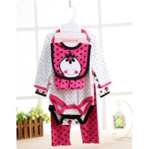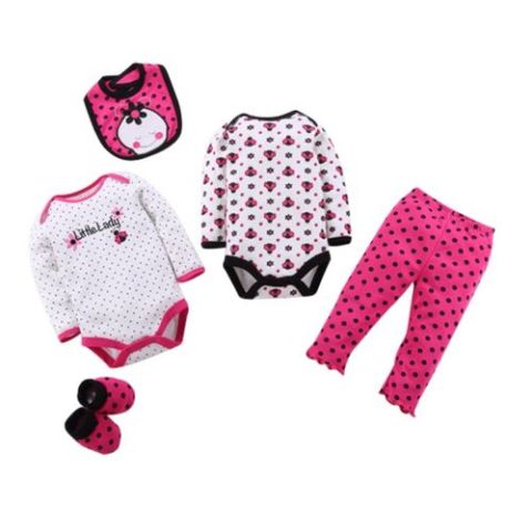 • Features: Set has 2 long sleeved rompers, 1 pair bootees, 1 pair of pants and 1 bib. The rompers have snaps for easy closing and diapering.