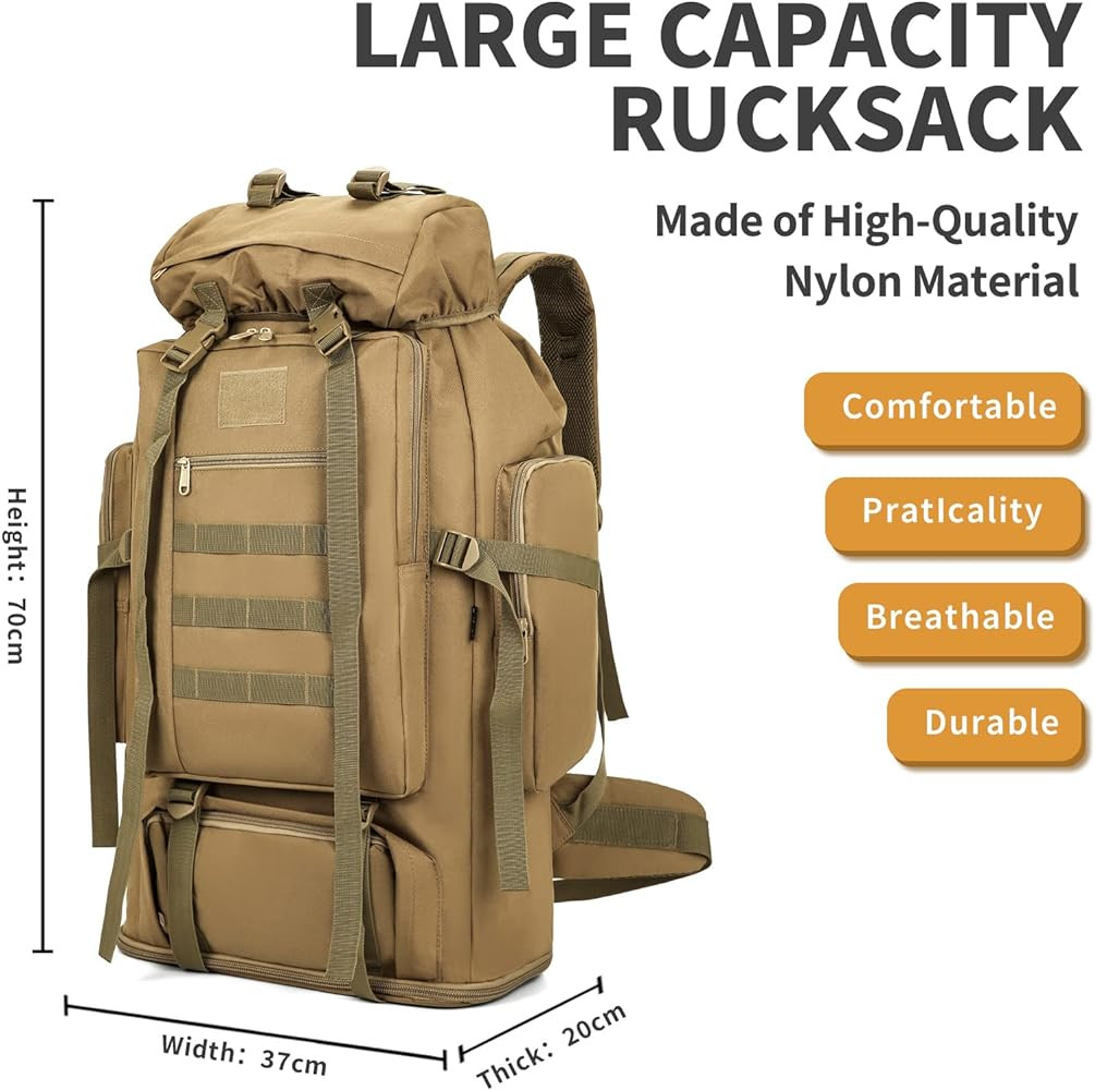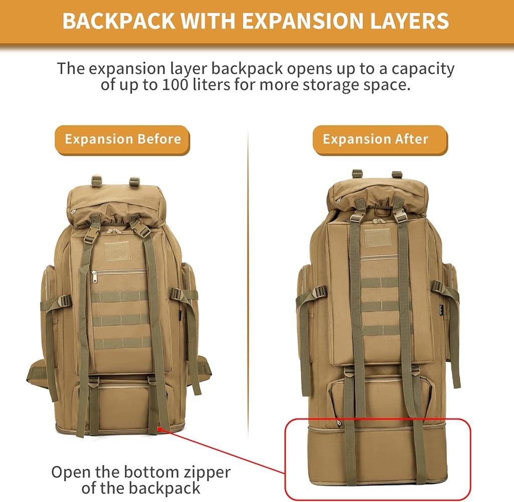 • 【Waterproof and Breathable Fabric】: The 100l tactical military backpack is made of 905D Oxford cloth fabric and waterproof material. The military backpacking bag thick density Tear Resisten Oxford cloth fabric is waterproof and wear-resistant, and the texture is tough and odorless. For traditional hiking backpacks, belts and high-quality zippers are better with durability and scratch resistance.
