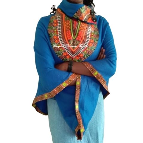 Blue Cotton Poncho With Dashiki Print
