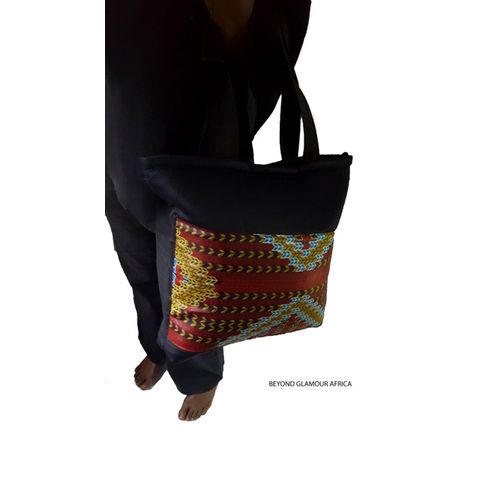 simple and classy shoulder bag .denim blue with ankara print in the front.easy to carry and move around with,spacious enough  with material that lasts long