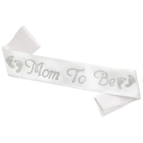 White Mom to be Sash Satin with Silver Glitter Baby Shower