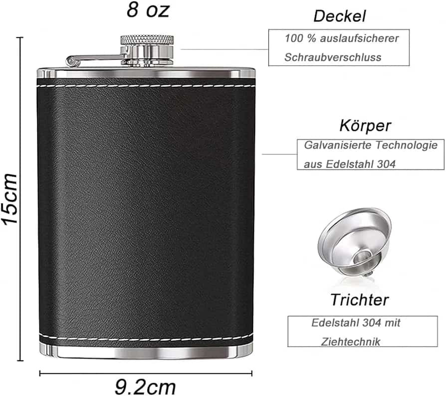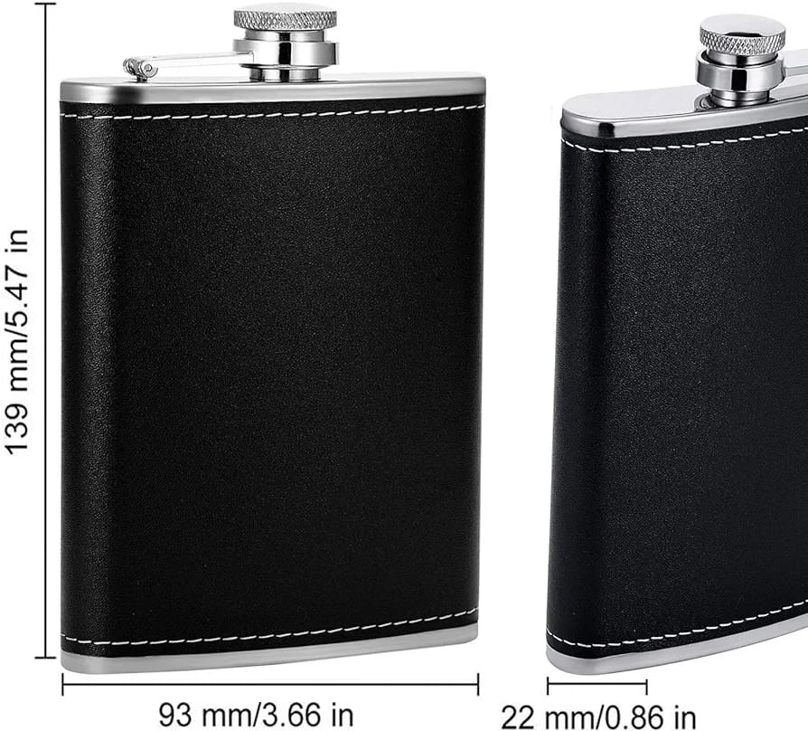 • 【ELEGANT LEATHER】Hip flasks for liquor is covered with premium black PU leather.This leather is easy to grab, store and hide in your suit, jeans pocket, jacket, fishing box, beach bag or travel bag.Even in the cold winter, you still feel warm with this leather flask for men.