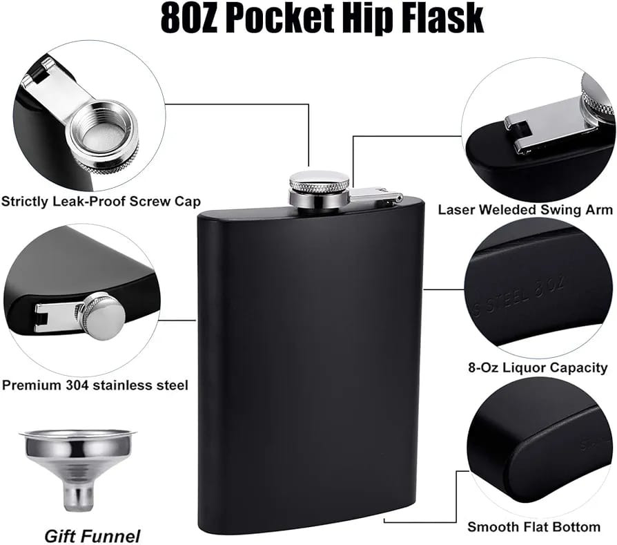 • 【18/8 STAINLESS STEEL】Hip flasks for liquor for men adopts high quality 18/8 316 stainless steel with unique durable laser welded hinge, the structure is very strong, the material is safe and non-toxic, stainless steel has good corrosion resistance, no need to worry about internal metal corrosion,hip flask gift set is light weight, small size, easy to carry.