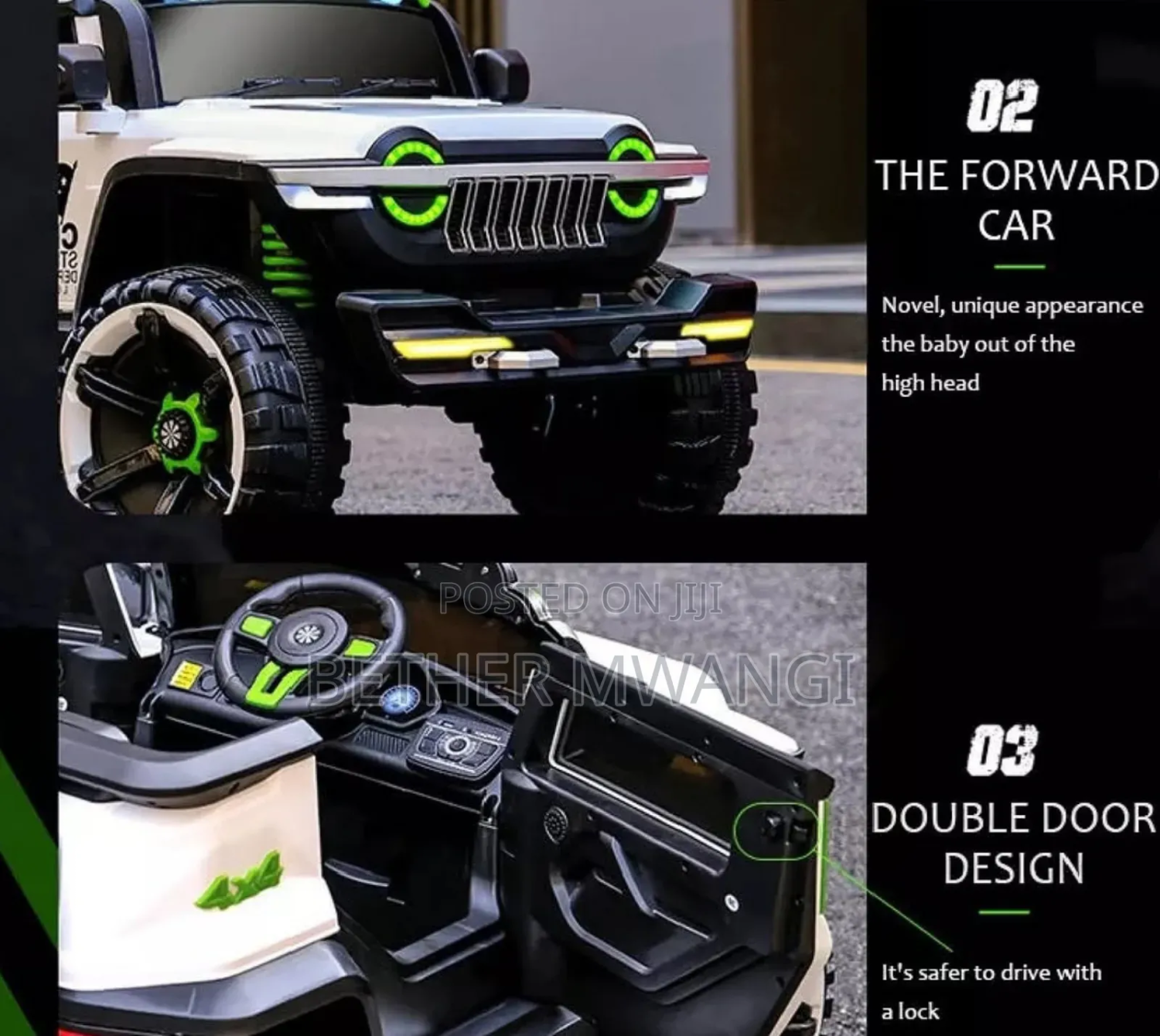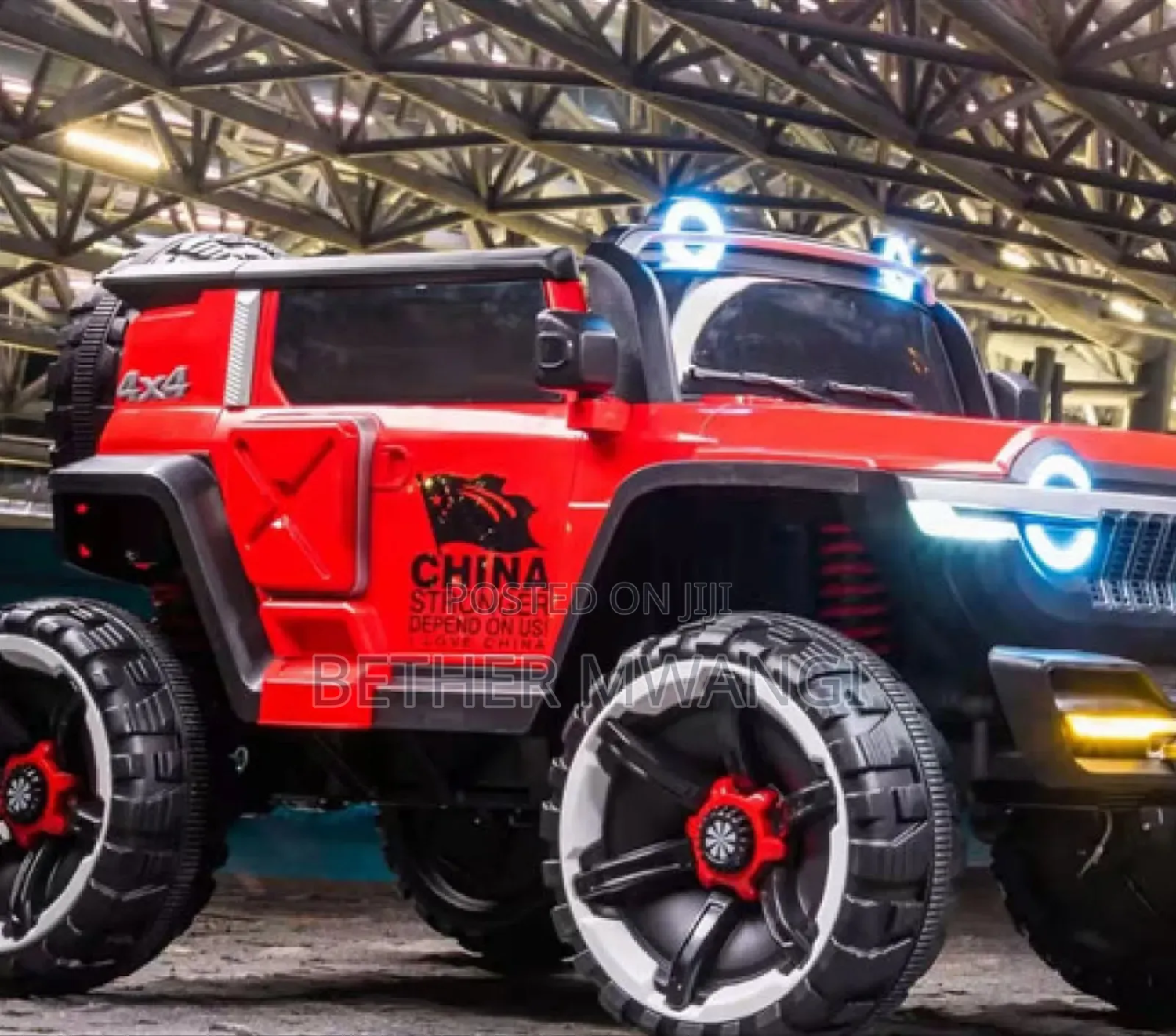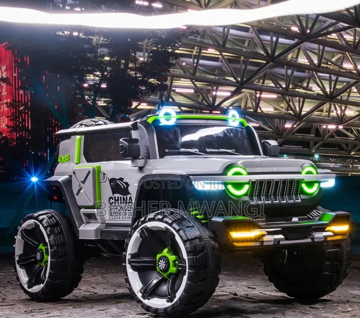 Product: jeep 4x4 1.2m size: 122 x 68 x 62 (2 seater) battery: 12v 10a tyre: soft rubber tyre (not plastic) seat: leather (not plastic) colour option: grey / white / red price: kes 65,000.