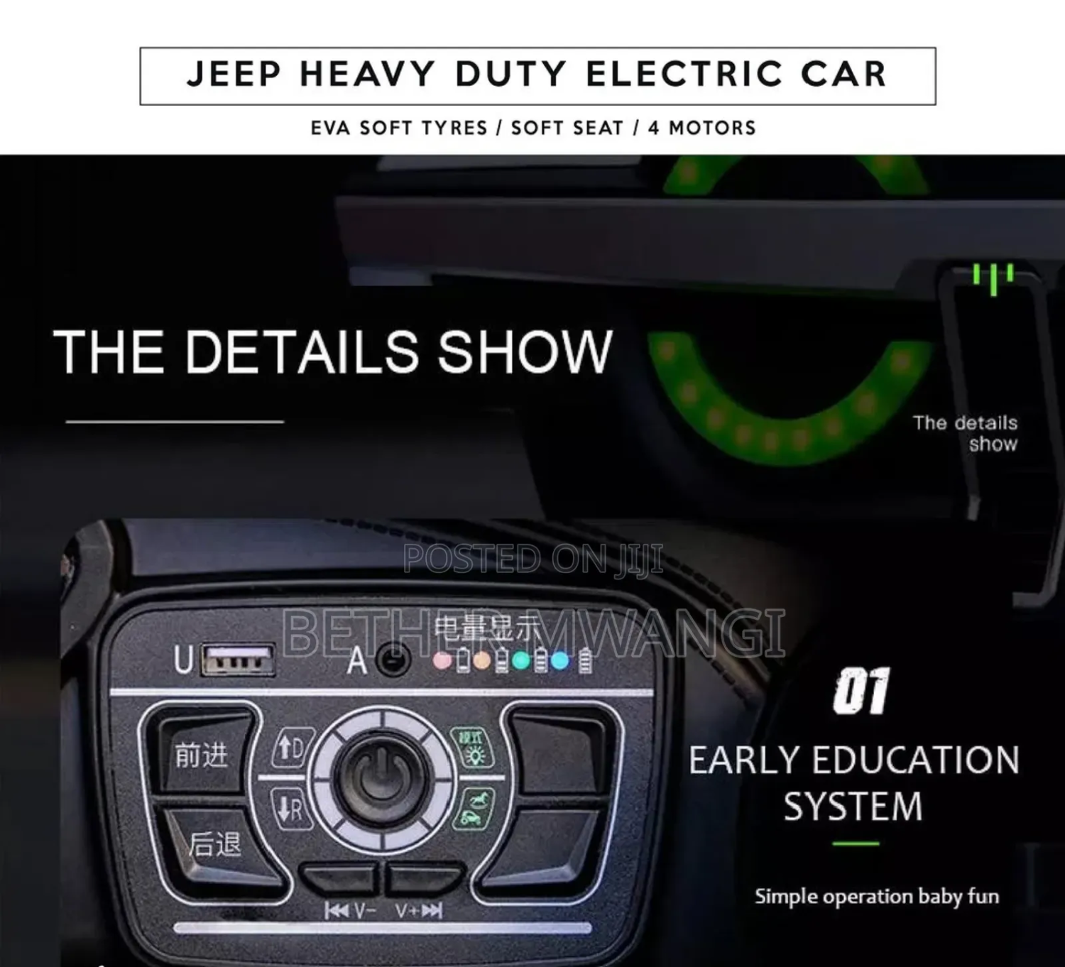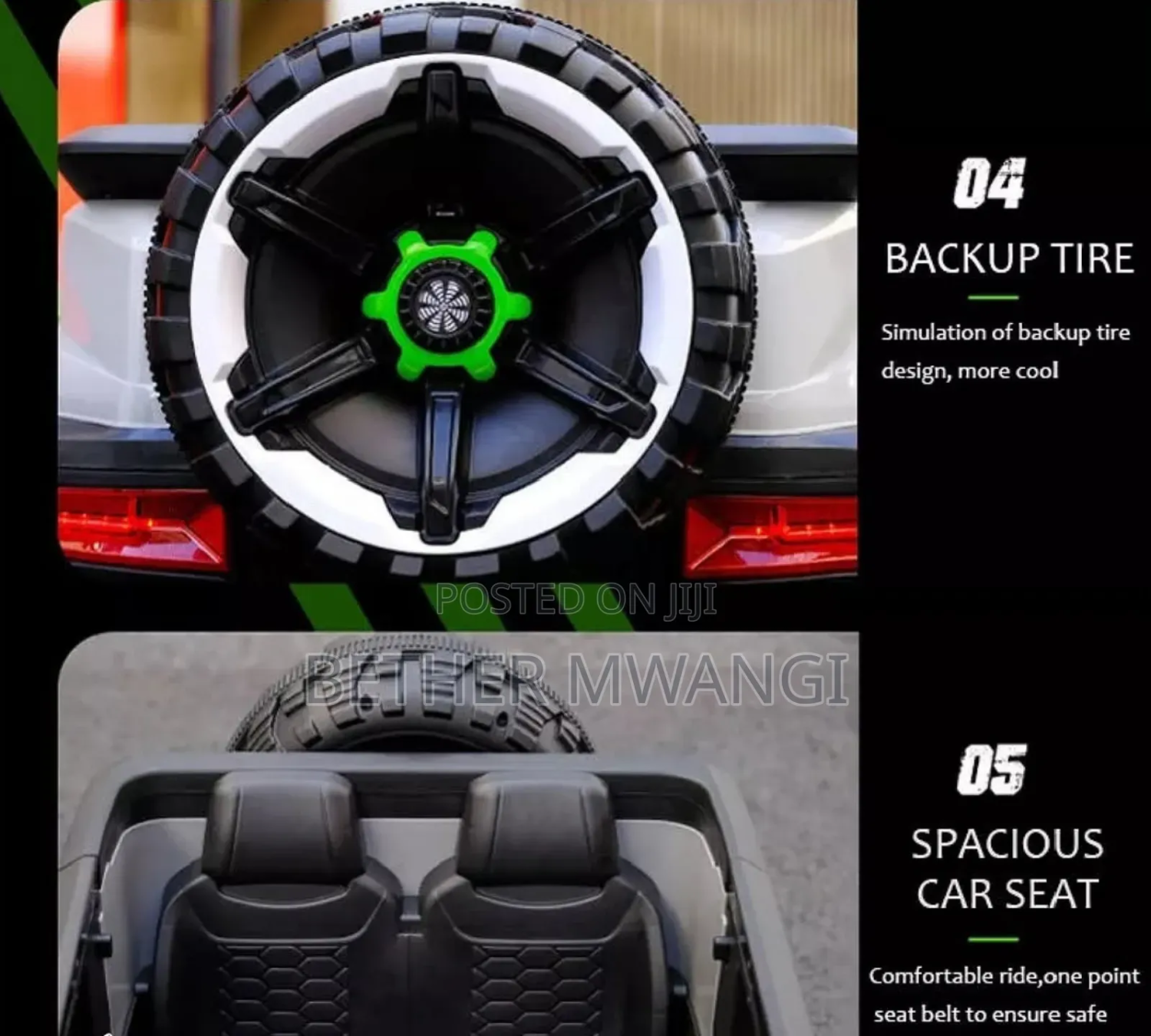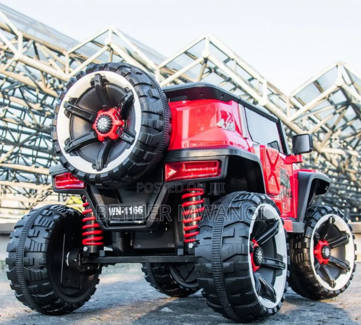 Product: jeep 4x4 1.2m size: 122 x 68 x 62 (2 seater) battery: 12v 10a tyre: soft rubber tyre (not plastic) seat: leather (not plastic) colour option: grey / white / red price: kes 65,000.