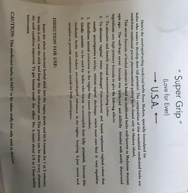 Insert this whole medicinal herbal stick into the vagina slowly and let it remain for 1 or 2 minutes; then take it out, was the stick and keep dry for subsequent use. This process can be done every alternate dry until condition improved. To get instant result for effect No: 4, insert about 1/2 or 1 bour before intercoures.