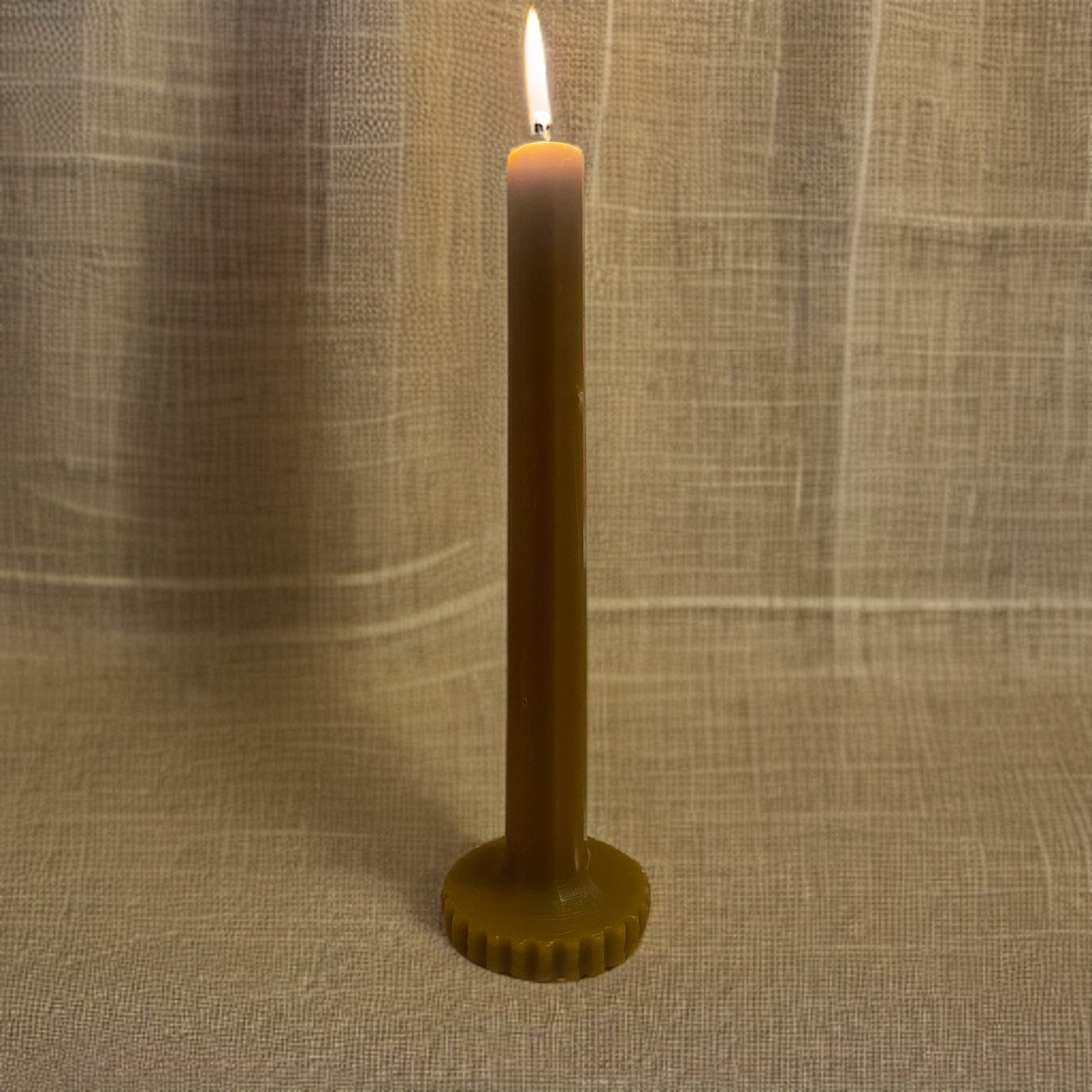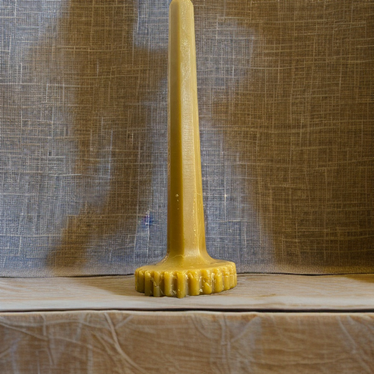 This long taper candle, made from beeswax, is enhanced by a wider base for added balance. Its refined look is ideal for formal settings or a dinner table, and it can be enjoyed with its light, natural scent or enhanced by our custom fragrances. Known for its slow, soot-free burn, this candle is both functional and decorative, adding a touch of sophistication while being environmentally conscious.