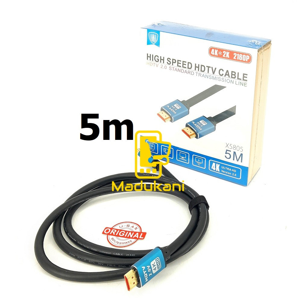 - 5-meter long HDMI to HDMI cable featuring a male-male connection.