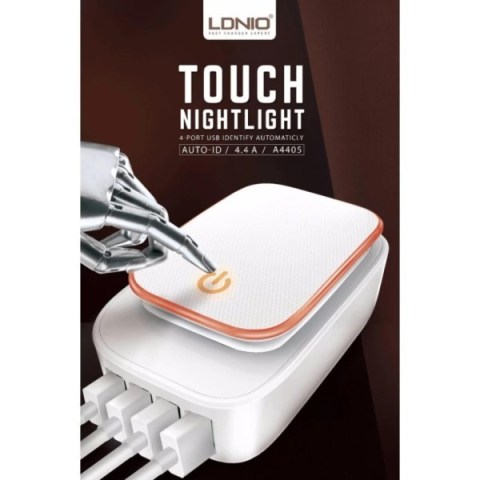 Brand Name : LDNIOQuality Certificate of ConformityQuality Certification : RoHSQuality Certification : FCCQuality Certification : Mandatory CertificateQuality Certification : SASOOutput Port : USBOutput Port : LIGHTNINGOutput Port : USB Type-CUSB ports : 4Power Source : AC SourceOutput Port : 5V / 4ASupport fast charge : NoReference : A4405Input Voltage : 100-240V / 0.8AType : Wall chargerColor : White with gold rimOutput power : 22W maxOutput current : 4.4A (Auto max)Type1 : Auto ID USB chargerType2 : home wall chargerPlug : EU PlugPlug Type : FoldableApplication1 : USB Charger for iPhone Samsung HuaweiFunction : Mobile Phone Charger, USB Adapter