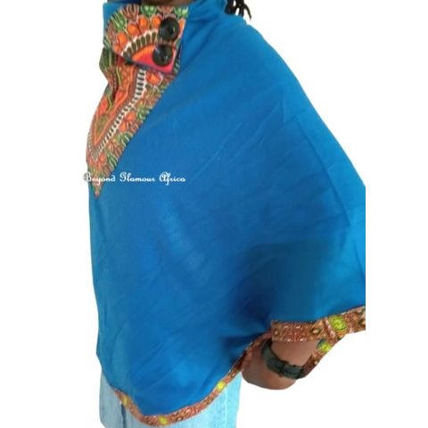 Blue Cotton Poncho With Dashiki Print