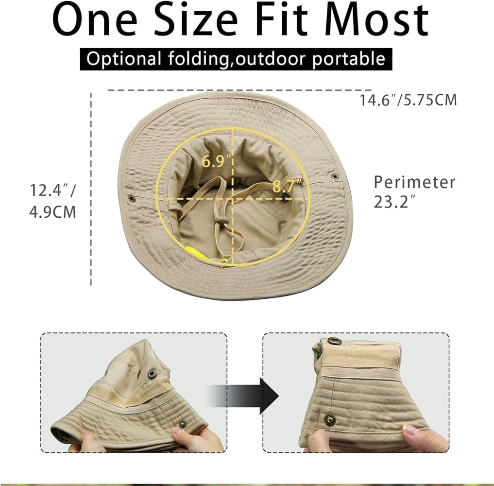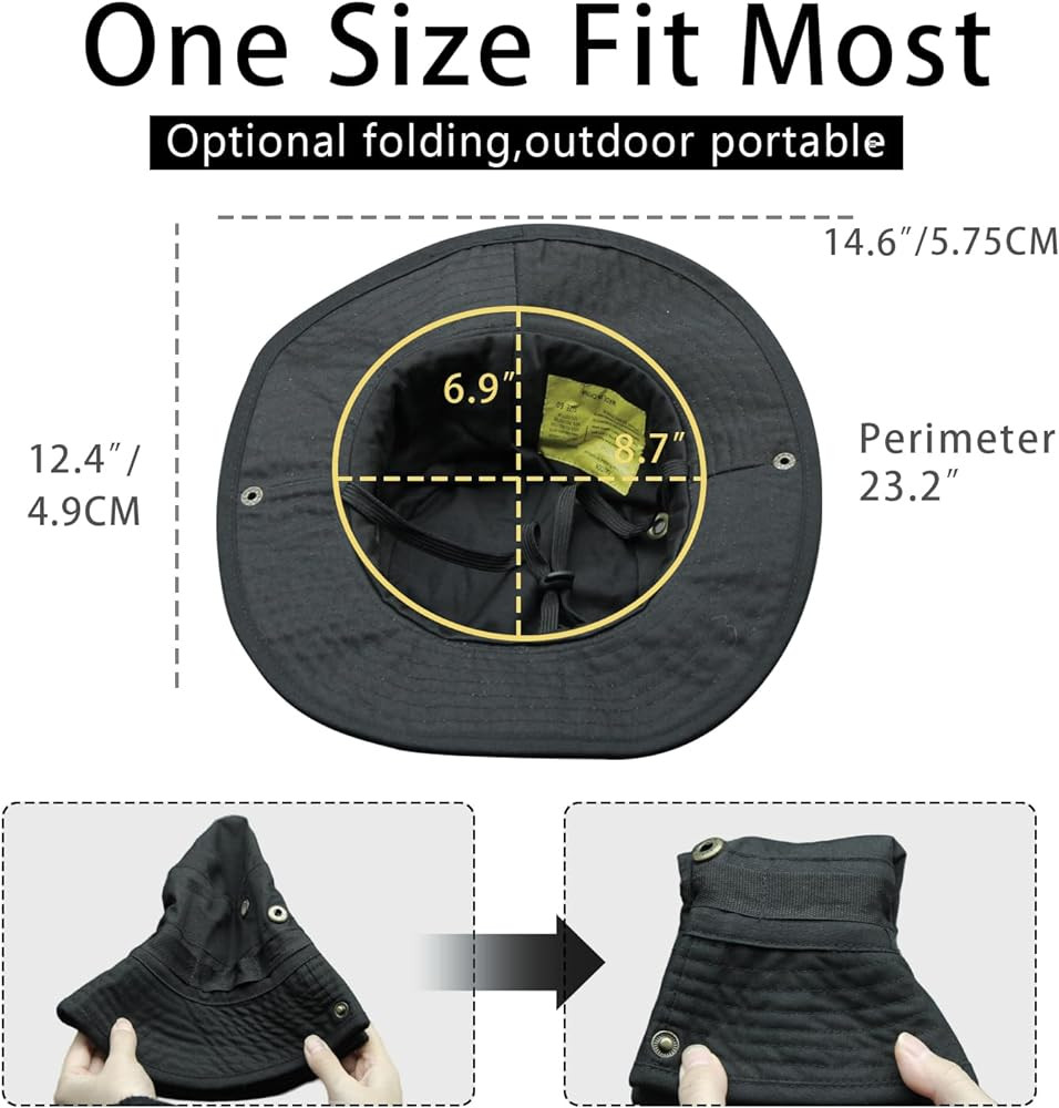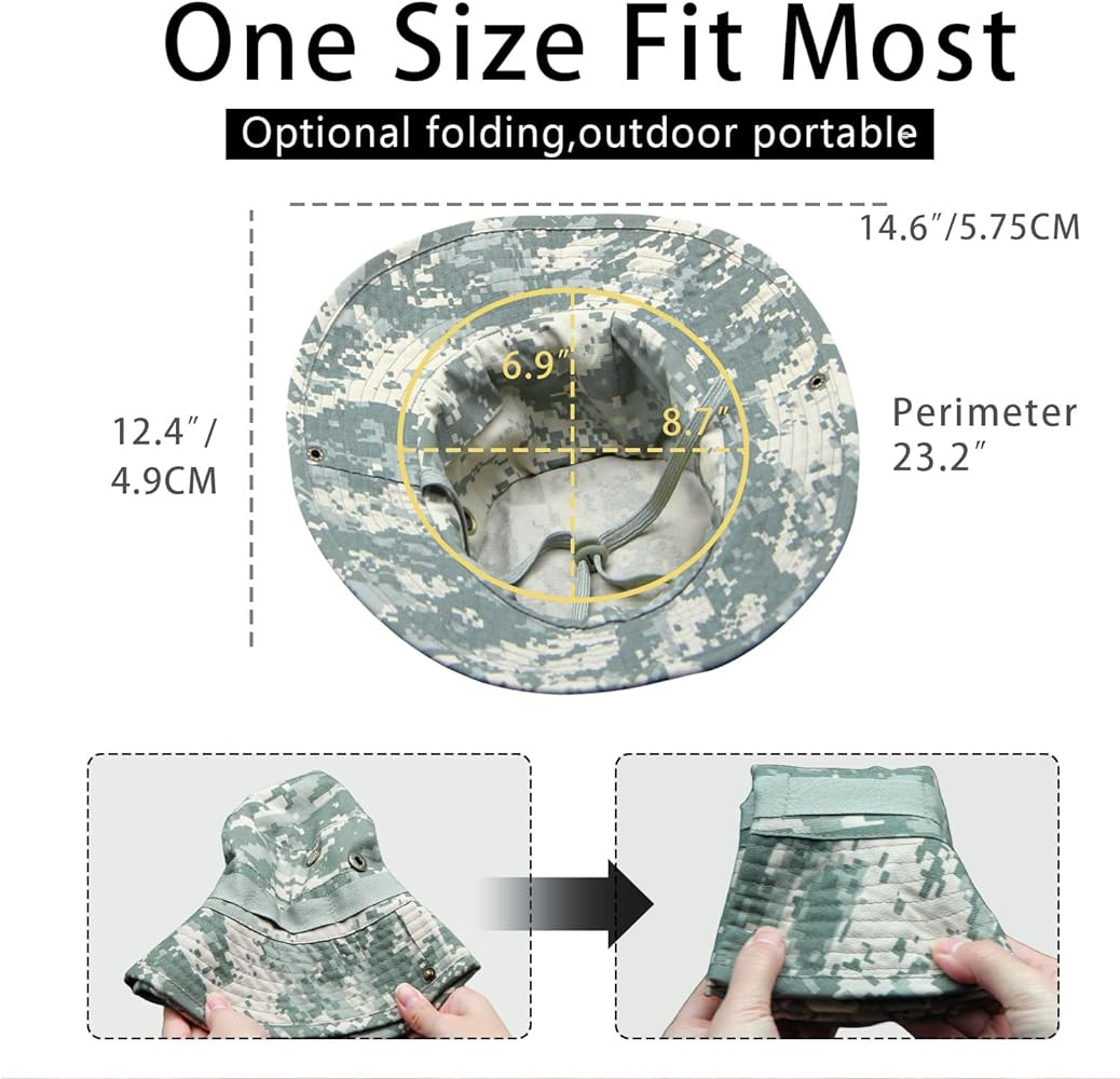 • Hat Size: One size fits most adults. Size: 7.5", Brim: 2.56", Head: 23.6". Perfect for hiking, camping, hunting, fishing, hiking, tourism, gardening, beach, military exercise or as a daily wear.
