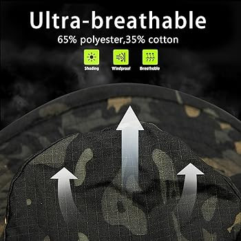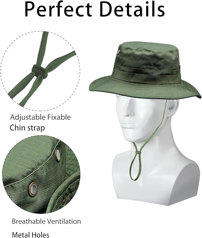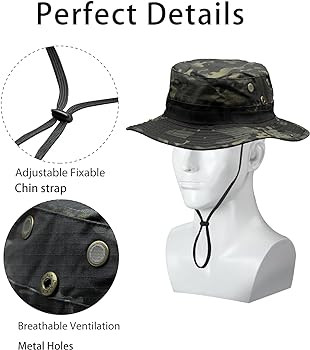 • Efficient Design: Comfortable hat with brass screen vents keeps you dry; The wide brim hat provides extra protection from the sun. Loops around the military boonie hat for adding additional camouflage or to secure small items.