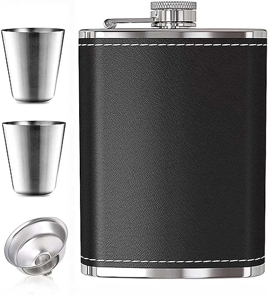 • 【ELEGANT LEATHER】Hip flasks for liquor is covered with premium black PU leather.This leather is easy to grab, store and hide in your suit, jeans pocket, jacket, fishing box, beach bag or travel bag.Even in the cold winter, you still feel warm with this leather flask for men.