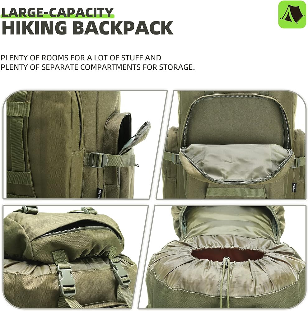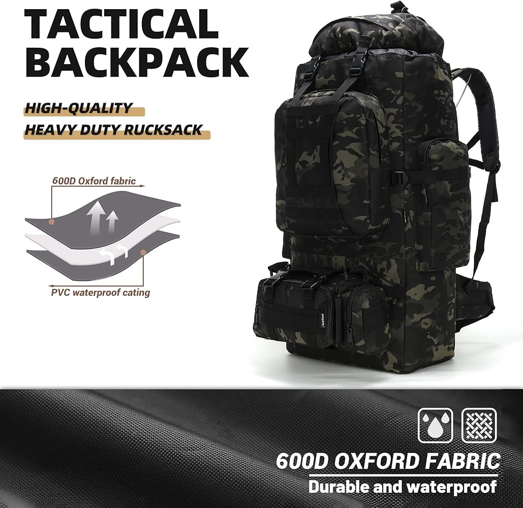 • 【Waterproof and Breathable Fabric】: The 100l tactical military backpack is made of 905D Oxford cloth fabric and waterproof material. The military backpacking bag thick density Tear Resisten Oxford cloth fabric is waterproof and wear-resistant, and the texture is tough and odorless. For traditional hiking backpacks, belts and high-quality zippers are better with durability and scratch resistance.