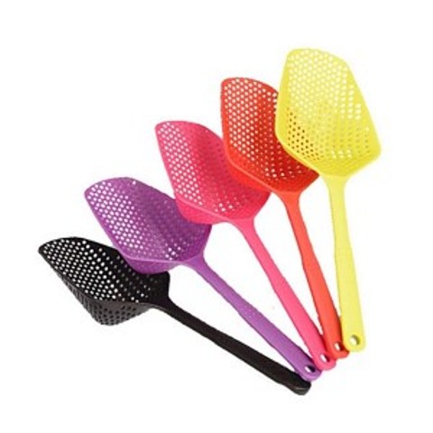 Scoop drains straight from a hot pan and rests on the side of a pan for draining.