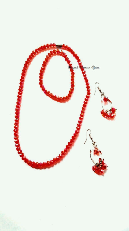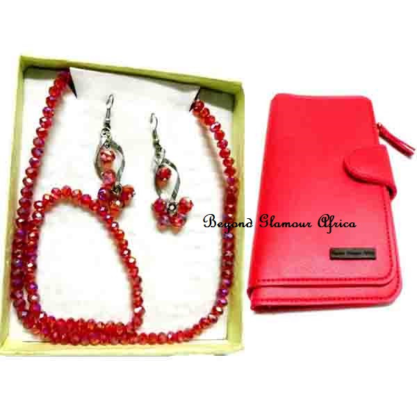 Classic jewelry set. Made with small crystal beads that overlaps on each other to bring out a a classy design, blends well with other colors and outfit designs. This jewelry set includes bracelet, earrings and necklace .It’s great first anniversaries and birthdays.This comes with a leather wallet